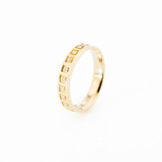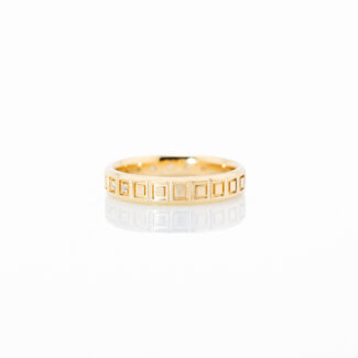 Zlatni prsten izrađen od 14K žutog zlata sa centralno postavljenim dijamantom u zatvorenom (bezel) okovu koji pruža savremeni izgled i dodatnu zaštitu kamenu. Dizajn krunice u obliku cveta sa otvorima oko dijamanta pojačava refleks svetlosti i stvara jedinstven vizuelni efekat. Obruč je gladak, zaobljen i poliran do visokog sjaja, naglašavajući jednostavnost i sofisticiranost prstena. Namenjen je ženama koje preferiraju elegantan, ali diskretan nakit sa simbolikom čistoće i postojanosti.