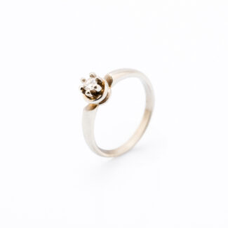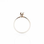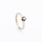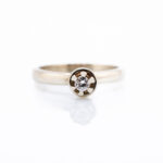 Zlatni prsten od 14k žutog zlata sa centralnim dijamantom u zatvorenom (bezel) okovu i krunicom u obliku cveta.
